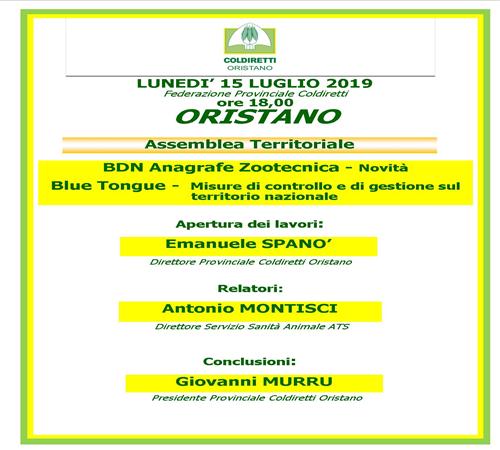 Lunedì 15 luglio, alle ore 18,00, presso la Federazione provinciale Coldiretti Oristano, si terrà una Assemblea territoriale dove si centrerà l'attenzione sulle novità relative alla BDN Anagrafe zootecnica e  sulle misure di controllo e di gestione sul territorio nazionale della Blue tongue.